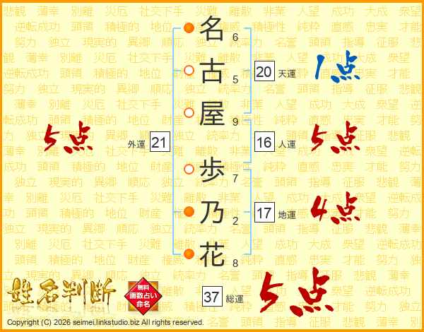 名(6画)古(5画)屋(9画) 歩(7画)乃(2画)花(8画)