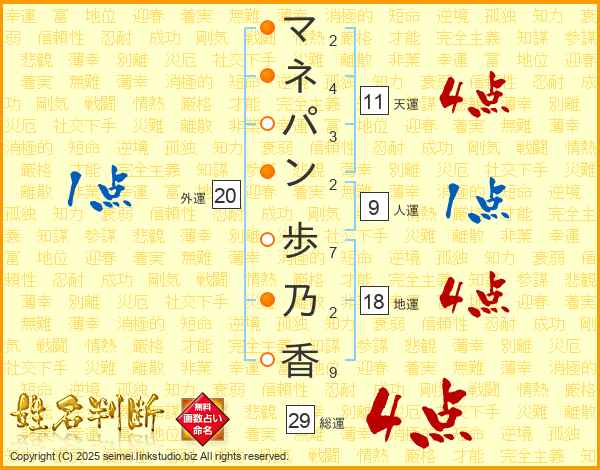 マ(2画)ネ(4画)パ(3画)ン(2画) 歩(7画)乃(2画)香(9画)