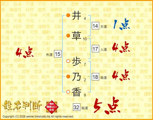 井(4画)草(10画) 歩(7画)乃(2画)香(9画)