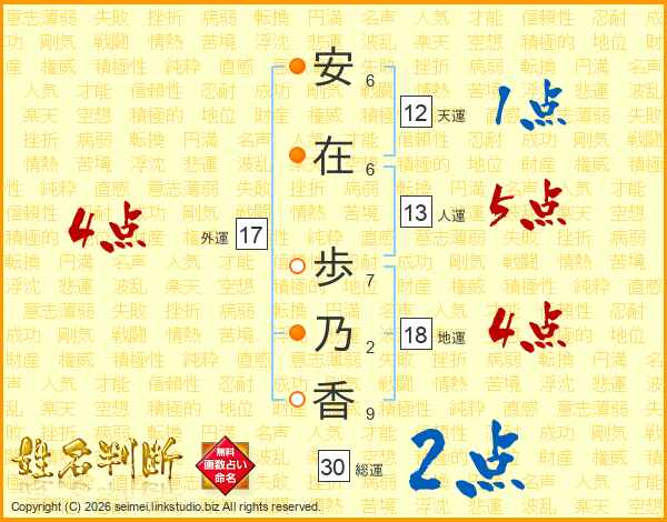 安(6画)在(6画) 歩(7画)乃(2画)香(9画)