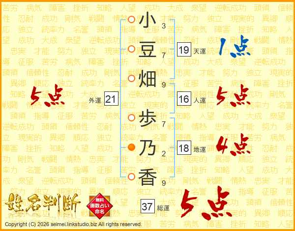 小(3画)豆(7画)畑(9画) 歩(7画)乃(2画)香(9画)