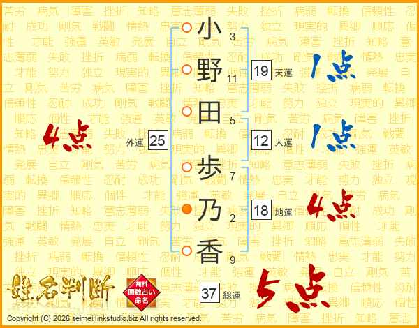 小(3画)野(11画)田(5画) 歩(7画)乃(2画)香(9画)