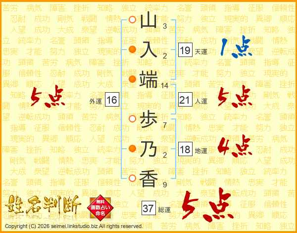 山(3画)入(2画)端(14画) 歩(7画)乃(2画)香(9画)