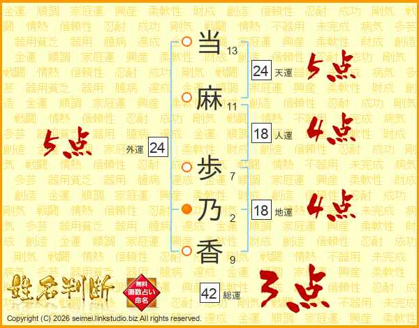 当(13画)麻(11画) 歩(7画)乃(2画)香(9画)