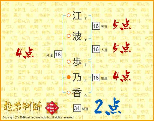 江(7画)波(9画) 歩(7画)乃(2画)香(9画)