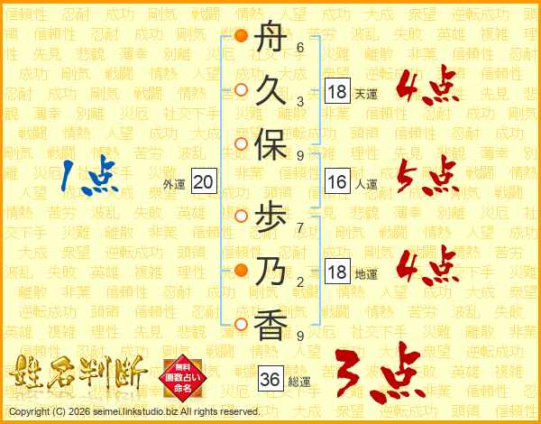 舟(6画)久(3画)保(9画) 歩(7画)乃(2画)香(9画)