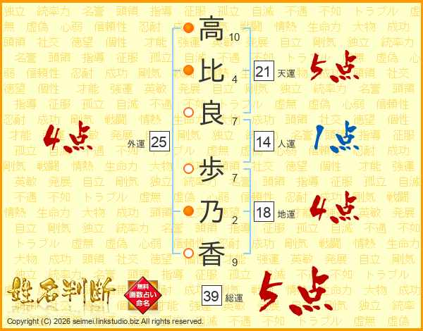 高(10画)比(4画)良(7画) 歩(7画)乃(2画)香(9画)