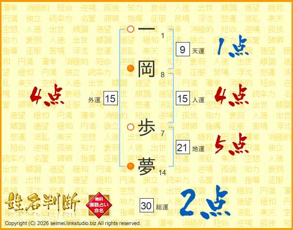 一(1画)岡(8画) 歩(7画)夢(14画)