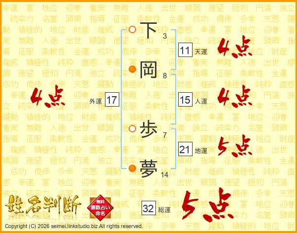 下岡歩夢さんの総運は32画の5点!
