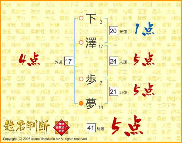 下澤歩夢さんの総運は41画の5点!
