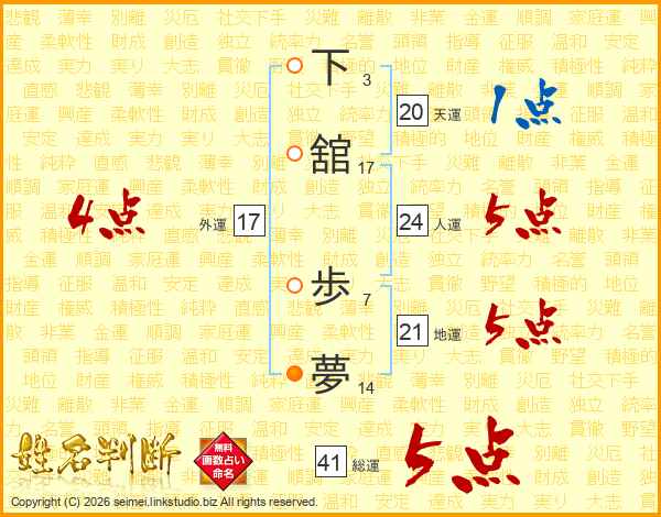 下(3画)舘(17画) 歩(7画)夢(14画)