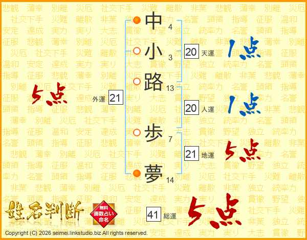 中(4画)小(3画)路(13画) 歩(7画)夢(14画)