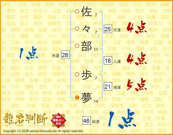 佐々部歩夢さんの天運は25画の4点!