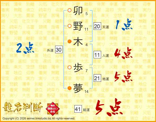 卯(5画)野(11画)木(4画) 歩(7画)夢(14画)