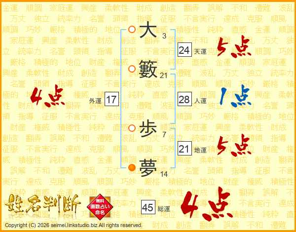 大(3画)籔(21画) 歩(7画)夢(14画)