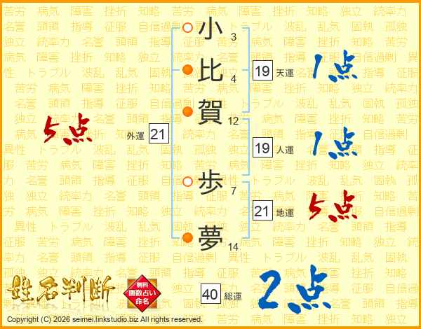 小(3画)比(4画)賀(12画) 歩(7画)夢(14画)