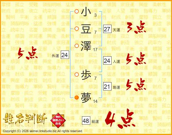 小豆澤歩夢さんの総運は48画の4点!