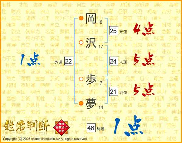 岡(8画)沢(17画) 歩(7画)夢(14画)