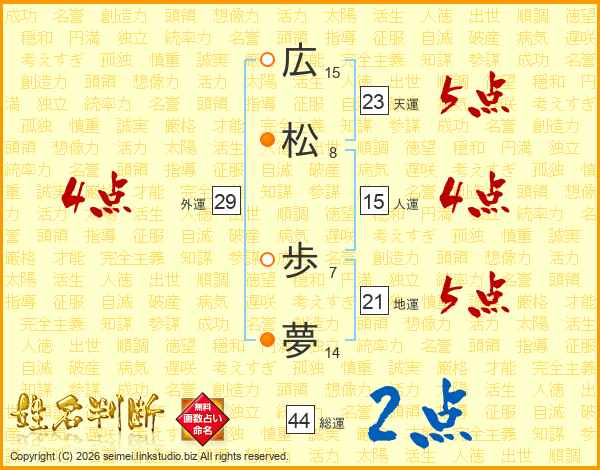 あなたの人生を表す1番重要な運勢です。生涯を通じて影響する総合運となり、主に50歳以降の晩年期に影響を及ぼします。苗字と名前の合計画数。