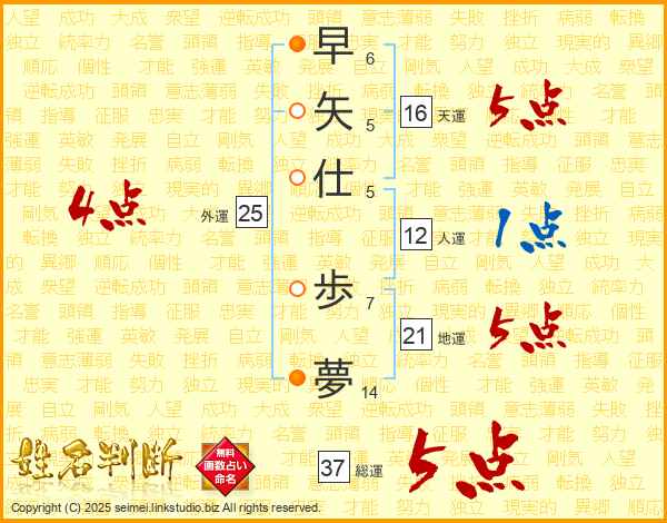 早(6画)矢(5画)仕(5画) 歩(7画)夢(14画)