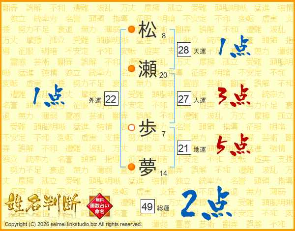 松(8画)瀬(20画) 歩(7画)夢(14画)
