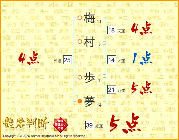 梅(11画)村(7画) 歩(7画)夢(14画)
