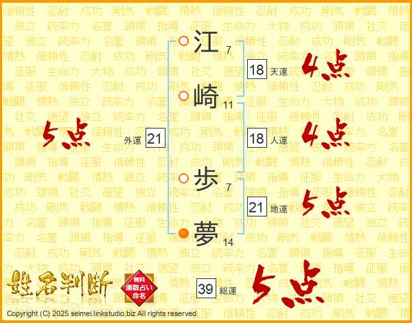 江(7画)崎(11画) 歩(7画)夢(14画)