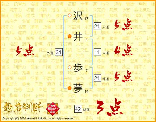 沢(17画)井(4画) 歩(7画)夢(14画)