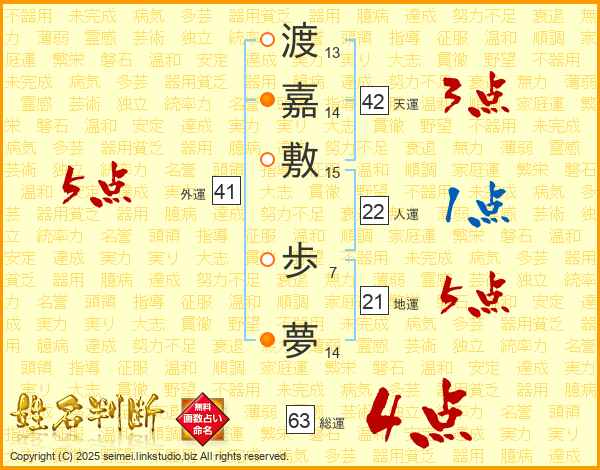 渡(13画)嘉(14画)敷(15画) 歩(7画)夢(14画)