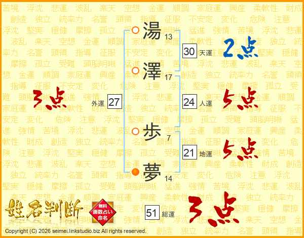湯澤歩夢さんの総運は51画の3点!