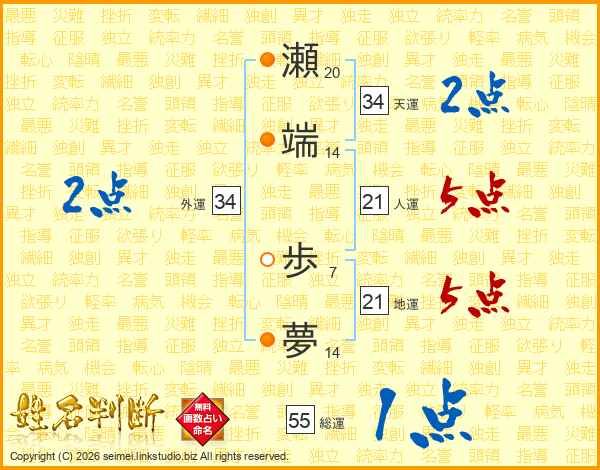 瀬端歩夢さんの総運は55画の1点!