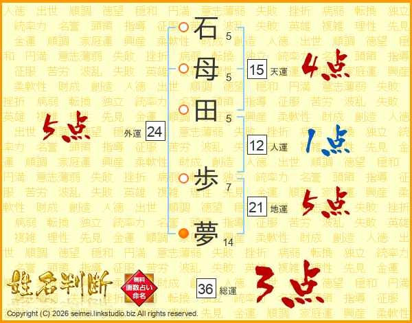 石(5画)母(5画)田(5画) 歩(7画)夢(14画)
