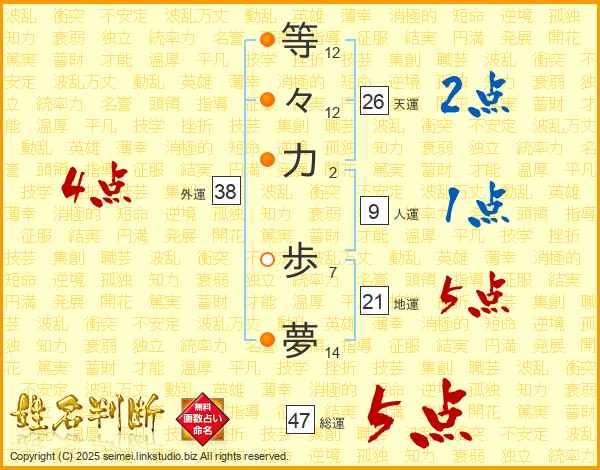 等(12画)々(12画)力(2画) 歩(7画)夢(14画)