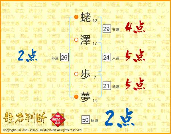 蛯(12画)澤(17画) 歩(7画)夢(14画)