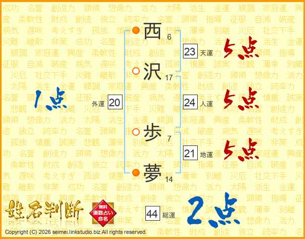西(6画)沢(17画) 歩(7画)夢(14画)