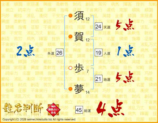 須(12画)賀(12画) 歩(7画)夢(14画)