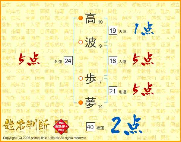 生活面を象徴する運勢です。外部から受ける影響力を表し、結婚運、家庭運や職場、環境への順応性を表します。総運から人運を引いた画数。姓や名が1文字の場合を除く。