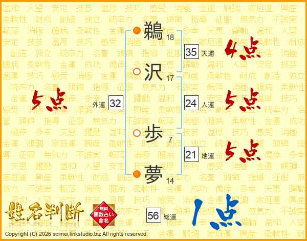 鵜(18画)沢(17画) 歩(7画)夢(14画)