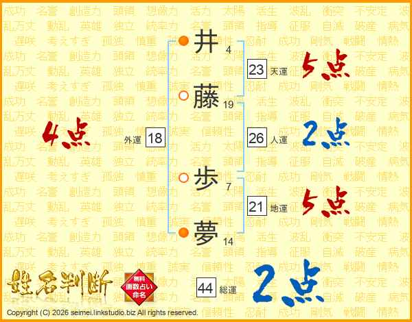 井(4画)藤(19画) 歩(7画)夢(14画)