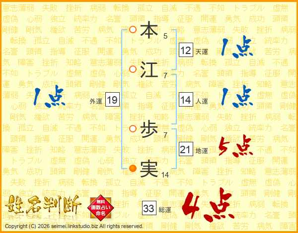 生活面を象徴する運勢です。外部から受ける影響力を表し、結婚運、家庭運や職場、環境への順応性を表します。総運から人運を引いた画数。姓や名が1文字の場合を除く。