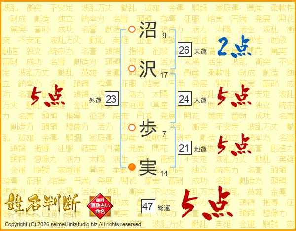沼(9画)沢(17画) 歩(7画)実(14画)