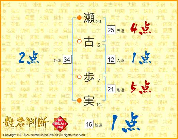 瀬(20画)古(5画) 歩(7画)実(14画)