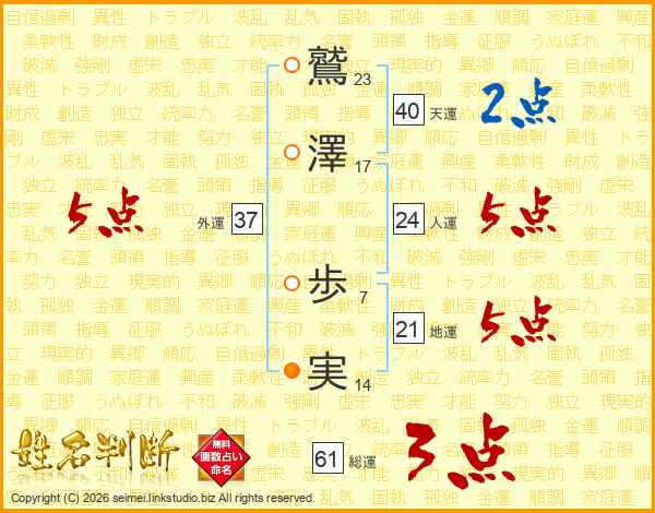 鷲(23画)澤(17画) 歩(7画)実(14画)
