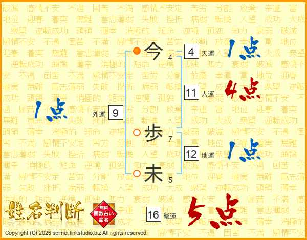 生活面を象徴する運勢です。外部から受ける影響力を表し、結婚運、家庭運や職場、環境への順応性を表します。総運から人運を引いた画数。姓や名が1文字の場合を除く。