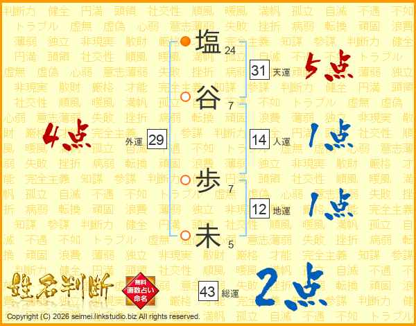 塩(24画)谷(7画) 歩(7画)未(5画)