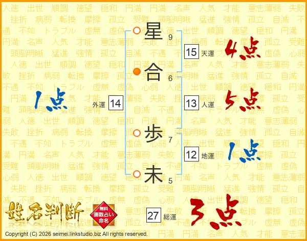 生活面を象徴する運勢です。外部から受ける影響力を表し、結婚運、家庭運や職場、環境への順応性を表します。総運から人運を引いた画数。姓や名が1文字の場合を除く。