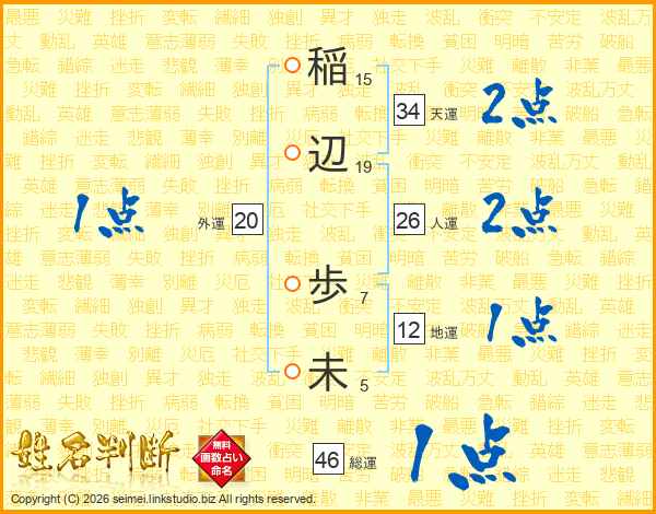 稲(15画)辺(19画) 歩(7画)未(5画)