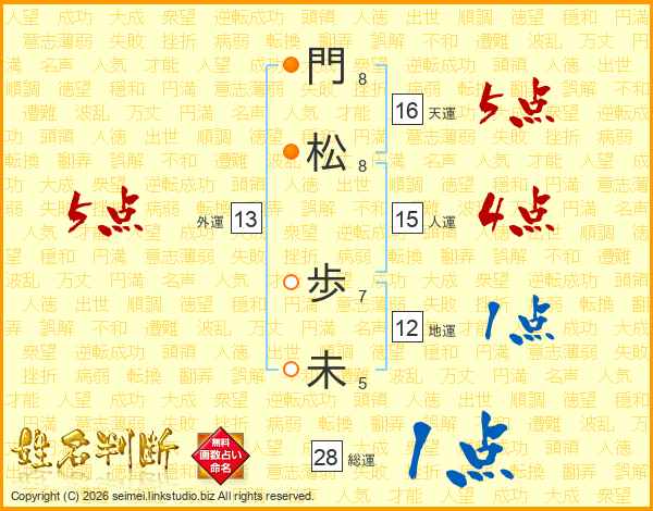 生活面を象徴する運勢です。外部から受ける影響力を表し、結婚運、家庭運や職場、環境への順応性を表します。総運から人運を引いた画数。姓や名が1文字の場合を除く。