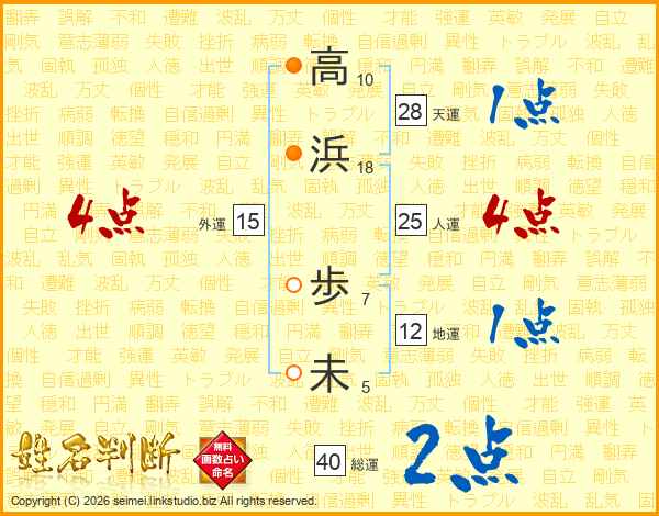 生活面を象徴する運勢です。外部から受ける影響力を表し、結婚運、家庭運や職場、環境への順応性を表します。総運から人運を引いた画数。姓や名が1文字の場合を除く。