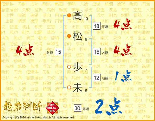 あなたの人生を表す1番重要な運勢です。生涯を通じて影響する総合運となり、主に50歳以降の晩年期に影響を及ぼします。苗字と名前の合計画数。